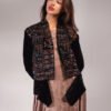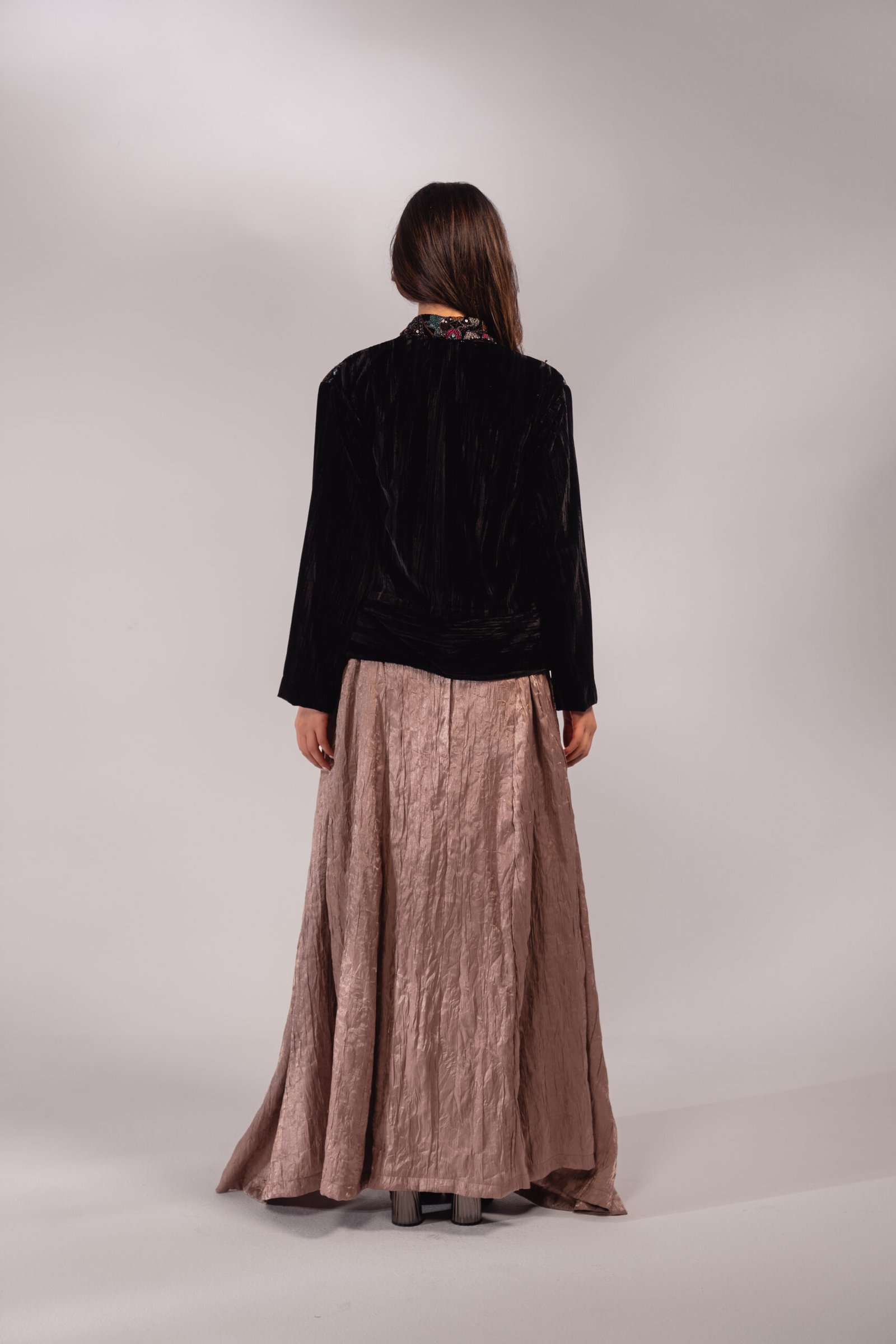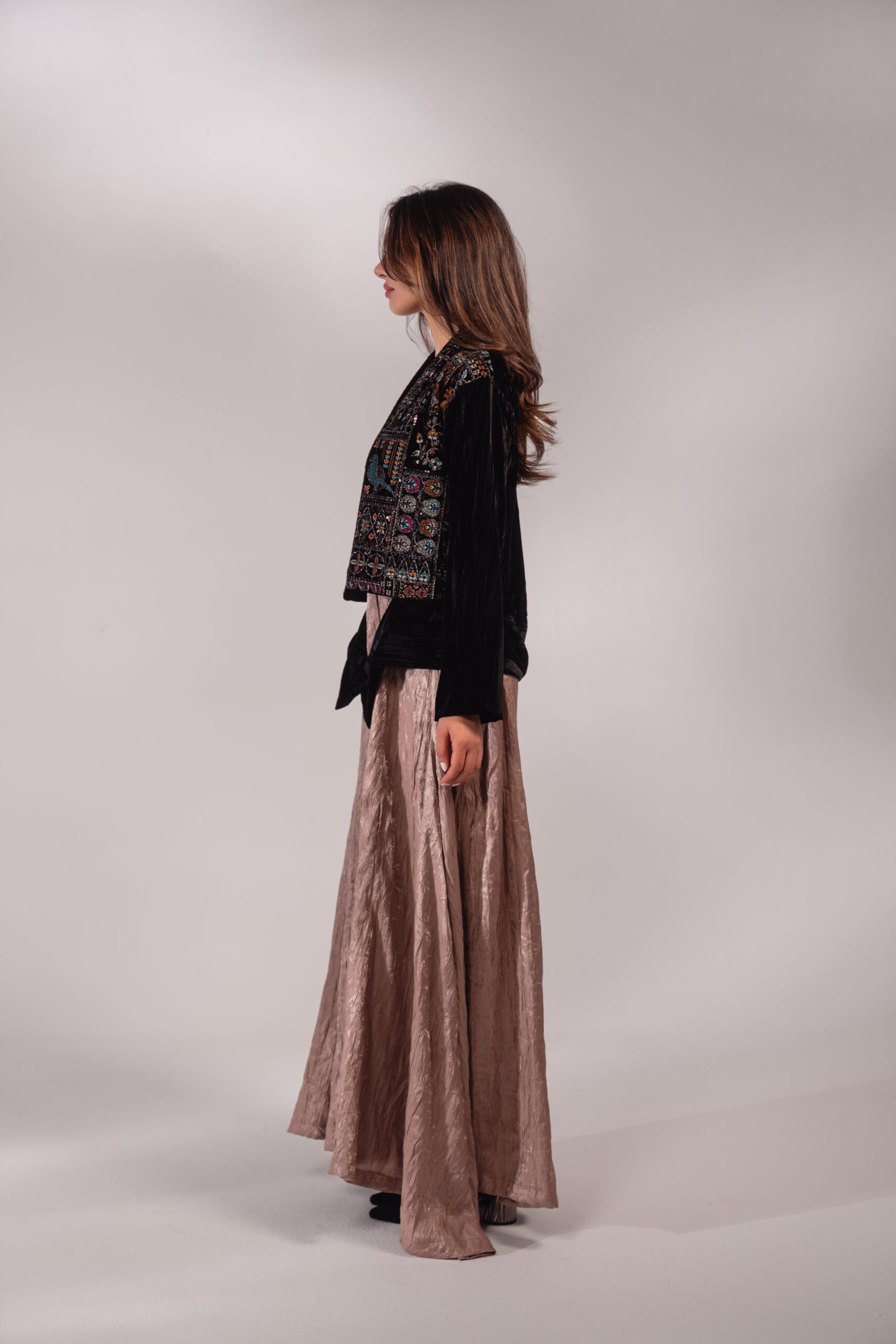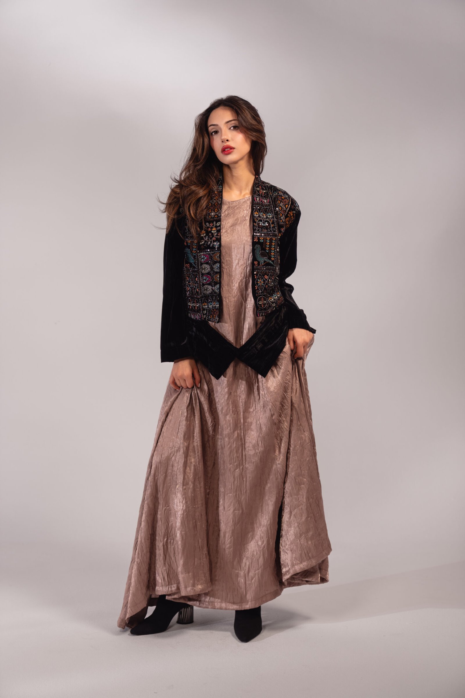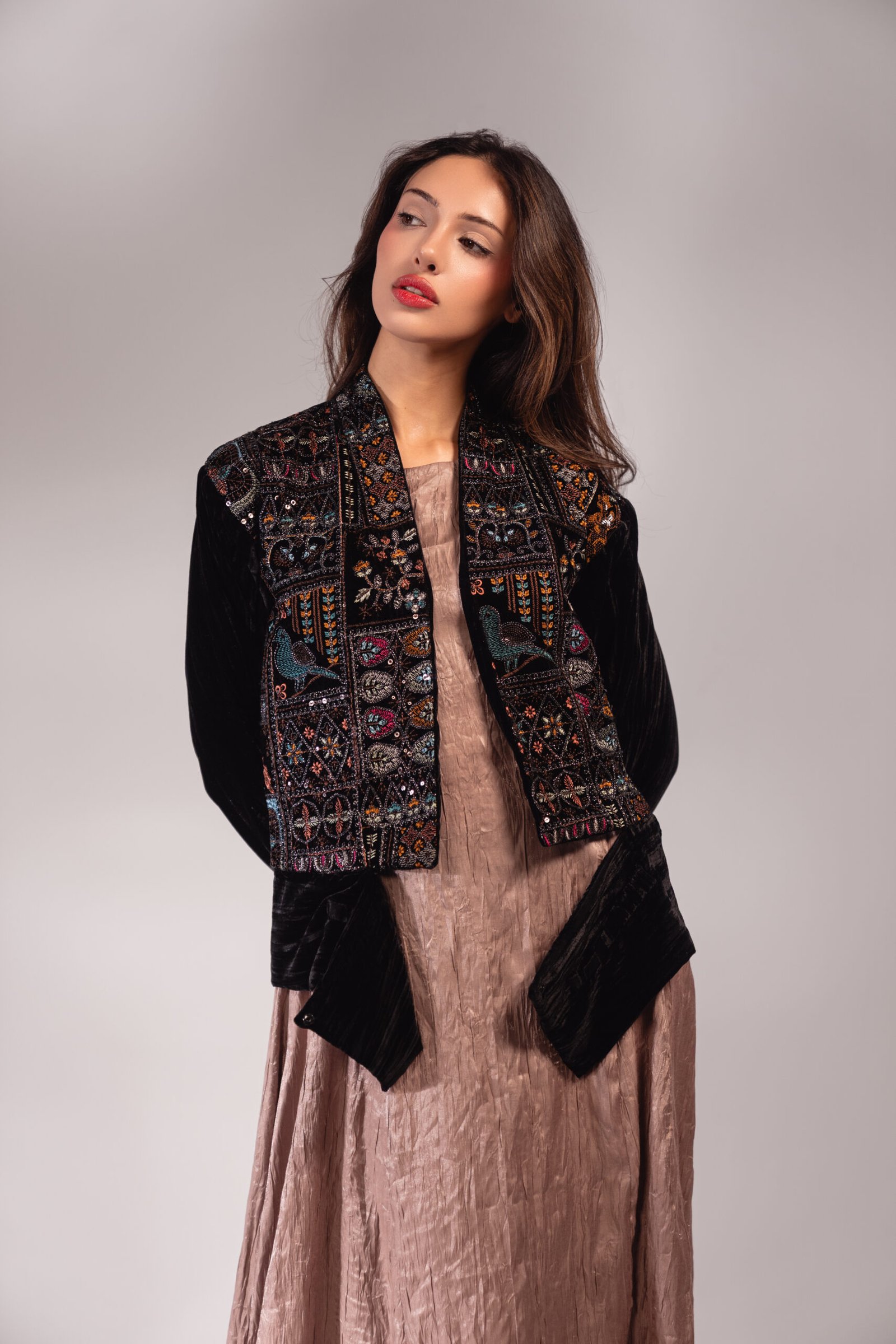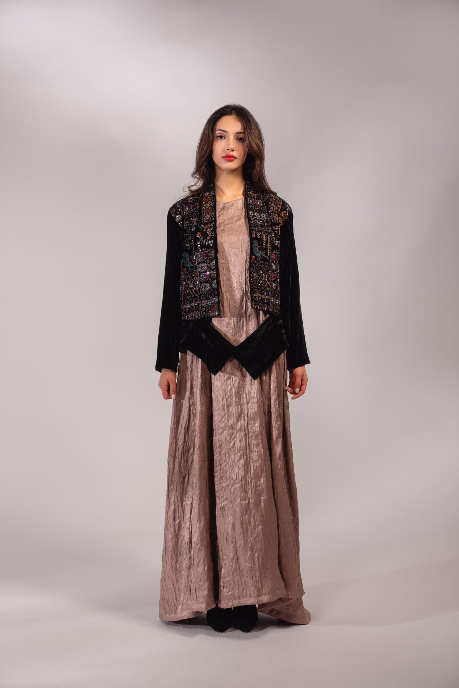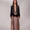 قطعتين دريس بلون النود مع كروب جاكيت أسود مخمل مطرز